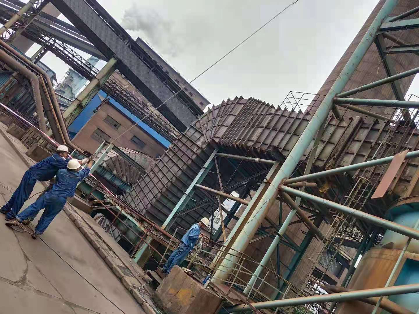 6月23日班前會(huì)檢修班長(zhǎng)劉武對(duì)六燒出口在線監(jiān)測(cè)平臺(tái)鋼板更換工作做了詳細(xì)的人員部署和安全注意事項(xiàng)講解。8:30檢修組人員到達(dá)現(xiàn)場(chǎng),吸收塔周邊拉好警戒線,其中3人到達(dá)除霧器平臺(tái)對(duì)地面人員進(jìn)行指揮,地面人員將鋼板掛在繩子的一端,另一端3人托攥繩子,通過(guò)定滑輪緩慢的將鋼板運(yùn)輸至除霧器平臺(tái)。采用相同的辦法,將運(yùn)輸至除霧器的鋼板又轉(zhuǎn)運(yùn)至在線監(jiān)測(cè)平臺(tái)。大家通過(guò)3小時(shí)的齊心協(xié)力,將30平方鋼板全部轉(zhuǎn)運(yùn)至出口在線監(jiān)測(cè)平臺(tái)。隨后檢修人員利用4小時(shí),安全、高效的將所有腐蝕的平臺(tái)更換完畢,完成了本次安全隱患消除項(xiàng)目。