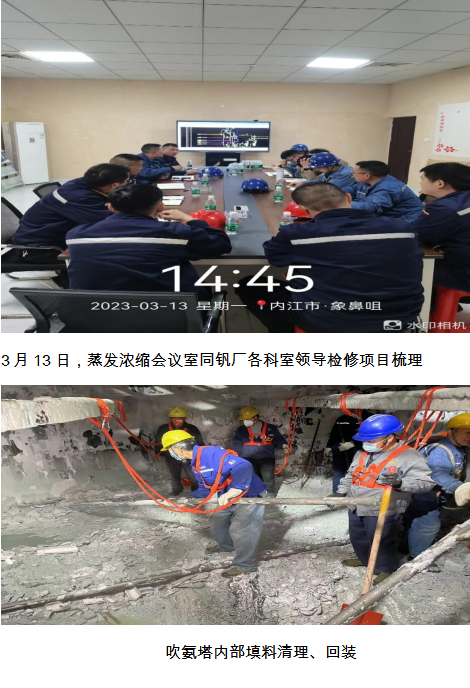 威遠藍鼎提釩廢水處理和蒸發(fā)濃縮項目,自去年10月份停機大修至今已有半年時間。運行過程中水處理吹氨塔填料堵塞漏蒸汽,蒸發(fā)濃縮各單元設備故障明顯增加,影響系統(tǒng)運行威遠藍鼎在釩廠回轉(zhuǎn)窯大修期間,提前消減廢水庫存至3000m3以下,避免廢水外送高爐。3月13日威遠藍鼎副總經(jīng)理黃安軍、副部長楊平、宋雨鵬在蒸發(fā)濃縮會議室組織釩廠各科室開展檢修協(xié)調(diào)會,告知釩廠相關(guān)領導本次檢修項目的重點、難點、風險點,為水處理爭取充足的檢修時間。