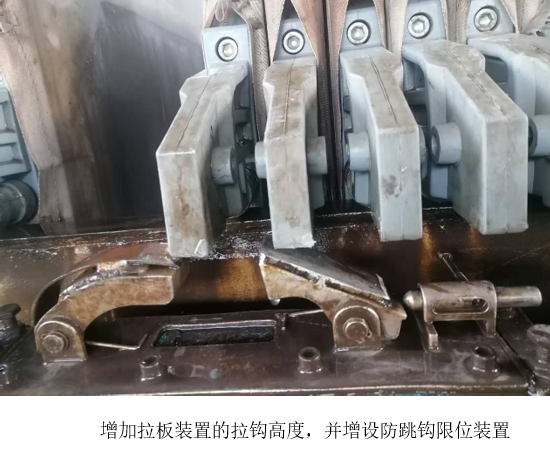 近日,西昌藍(lán)鼎二期壓濾機(jī)因新舊壓板存在約15毫米的高度差,導(dǎo)致自動拉板裝置無法正常運(yùn)作,操作人員不得不頻繁手動干預(yù),勞動強(qiáng)度顯著增加。面對這一問題,檢修班長提出通過提升拉鉤高度并增設(shè)防跳鉤限位裝置的解決方案,使拉鉤能夠靈活適應(yīng)不同高度的壓板。該方案經(jīng)生產(chǎn)部綜合評估,被認(rèn)定為切實(shí)可行。