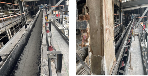脫水系統(tǒng)是脫硫脫硝系統(tǒng)必經(jīng)的最后一環(huán),自2021年1月19日濕法一期項(xiàng)目投產(chǎn)以來,一、二期脫水石膏已產(chǎn)出25萬噸左右,在實(shí)踐運(yùn)行中得知1#、2#石膏倉結(jié)構(gòu)設(shè)計存在瑕疵(內(nèi)部襯板為不沾板加之整個承載主體框架與綜合辦公樓緊密相連),造成卸料裝車期間經(jīng)常出現(xiàn)上百噸石膏在倉內(nèi)瞬間垮塌的現(xiàn)象,由此產(chǎn)生的巨大沖擊力直接影響辦公樓震動,產(chǎn)生的震動不亞于2級地震,嚴(yán)重危及安全穩(wěn)定,并且由于該石膏倉內(nèi)部沒有防腐措施,鋼板已存在較為嚴(yán)重的……